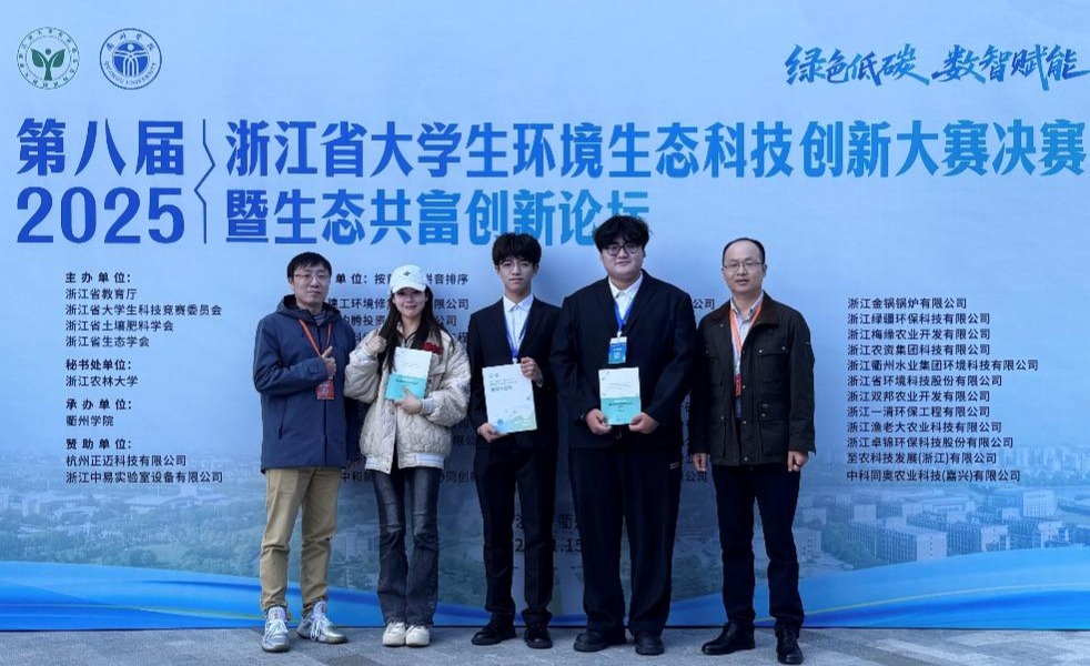 11月15日至16日,第八届浙江省大学生环境生态科技创新大赛决赛暨生态共富创新论坛在衢州学院举办。我院学子在本科生赛道脱颖而出,其中,《绿色铁基生物质炭对水稻土典型重金属钝化效果及机理研究》(学生负责人:李苏映;指导教师:李章涛、孟俊)获本科生赛道一等奖,《炭际微环境中功能菌群的构建与应用》(学生负责人:杨政也;指导教师:刘文波、李章涛)获本科生赛道三等奖。