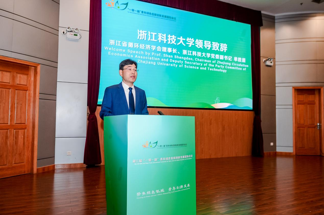 开幕式上,学校党委副书记、浙江省循环经济学会理事长单胜道代表主办方致欢迎辞。他表示,在全国深入学习贯彻党的二十届四中全会精神的关键时期,本次会议的召开对于实现国家“双碳”目标和推动大学生绿色低碳教育具有重要现实意义与时代价值。本次会议将进一步整合高校、政府、企业资源,为全球青年搭建高水平交流平台,推动青年智慧和低碳科技创新成果更好服务于全球绿色发展。
