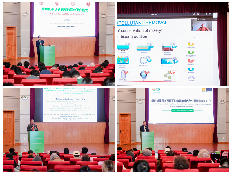 本届会议由中国循环经济协会、浙江省大学生科技竞赛委员会指导,由浙江科技大学、比利时根特大学和浙江省循环经济学会共同举办,得到中国国际科技促进会、杭州师范大学、《环境污染与防治》杂志社、浙江省绿色科技文化促进会等单位支持。北京大学金融与产业发展研究中心窦尔翔教授作题为《绿色低碳创新发展的三公平台模式——基于大系统、大逻辑、大模型的TRIF论》的报告,比利时根特大学工业和生态技术实验室主任Stijn Van Hulle教授作题为《Optimisation of Advanced Oxidation/Reduction Processes in View of Micro-Pollutant Removal from (Waste)Water with Different (Natural)Organic Matter Content》的报告,孟加拉农业大学农业经济与农村社会学学院Mohammad Jahangir Alam教授作题为《The Role of Land System as an Institutional Arrangment in Rural Transformation: Evidence from Bangladesh》的报告,浙江科技大学碳中和创新研究中心主任李俊研究员作题为《绿色创业导向视角下影响青年绿色创业因素的实证研究》的报告。17名青年学者聚焦绿色低碳创新发展前沿议题作交流发言,碰撞思维火花,凝聚创新共识,分享实践经验。
